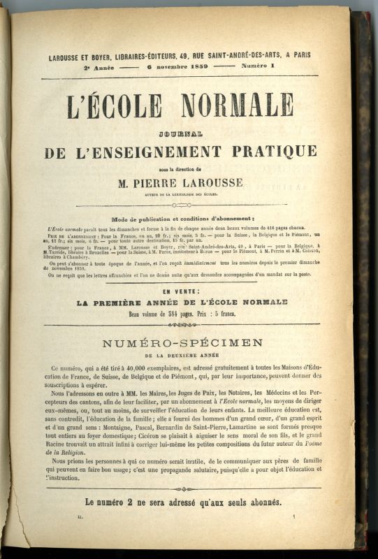 L'École normale, Journal d'instruction et d'éducation imaginé par Pierre Larousse paraît pour la première fois en novembre 1858. C’est un fascicule hebdomadaire à destination des maîtres qui contient des exercices de grammaire, d’orthographe et de calcul. Les rubriques s’intitulent « Exercices préparatoires de style », « Récréation mathématique », « Curiosités scientifiques », « Jardin des racines latines », ou « Étude raisonnée du dictionnaire ».