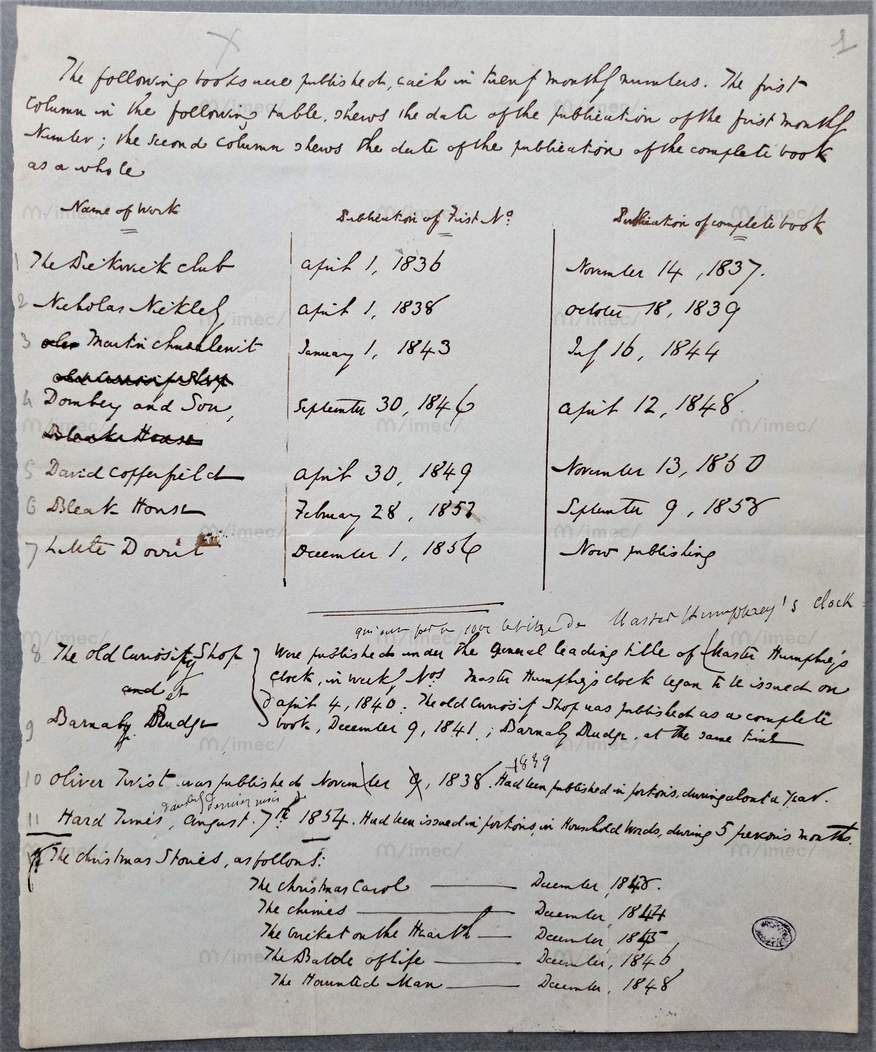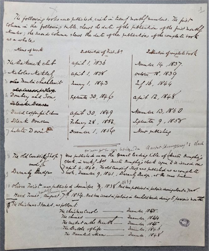 En janvier 1856, Charles Dickens doute. « When I wrote, hastily, the titles of my romances, I forgot Oliver Twist which is distinctly one of them [2]». À quoi il lui est répondu « Ce n’est point Oliver Twist que vous aviez omis dans la liste jointe à votre lettre du dix de ce mois ; c’est Master Humphrey’s Clock qui formera deux volumes et en conséquence portera à douze romans et vingt volumes l’importance de notre publication, non compris les autres ouvrages [3]». Toutefois, Charles Dickens n’avait pas oublié Oliver Twist et la confusion sur les titres et volumes vient du fait que The Old Curiosity Shop et Barnaby Rudge ont d’abord été publiés dans la revue Master Humphrey’s Clock. La liste définitive sera établie par un contrat du 1er février 1856 [4], reprenant celle établie par Charles Dickens.