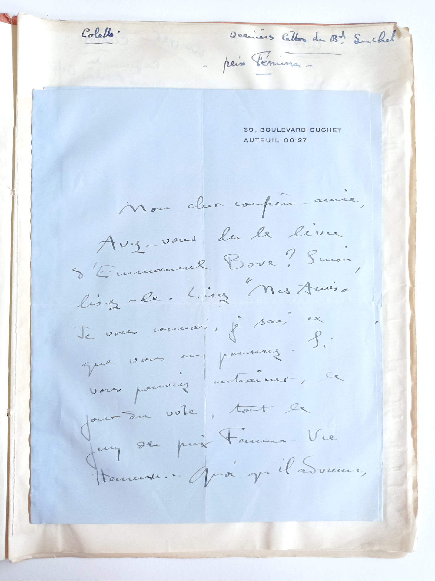 Avec ces deux lettres adressées à Madeleine Brisson, directrice des Annales politiques et littéraires et tout nouveau membre du jury du prix Fémina, elle veille à faire connaître son « protégé » en vue de la remise du prix en fin d’année. Dans la première lettre, elle compte d’abord sur sa correspondante : « si vous pouviez entraîner, le jour du vote, tout le jury du prix Fémina-Vie heureuse… ».
