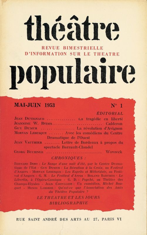 Par ailleurs, la création de la revue Théâtre Populaire, 54 numéros publiés par L’Arche entre 1953 et 1964, a pour point de départ le modèle esthétique et théorique porté par Jean Vilar au Théâtre National Populaire à Chaillot.