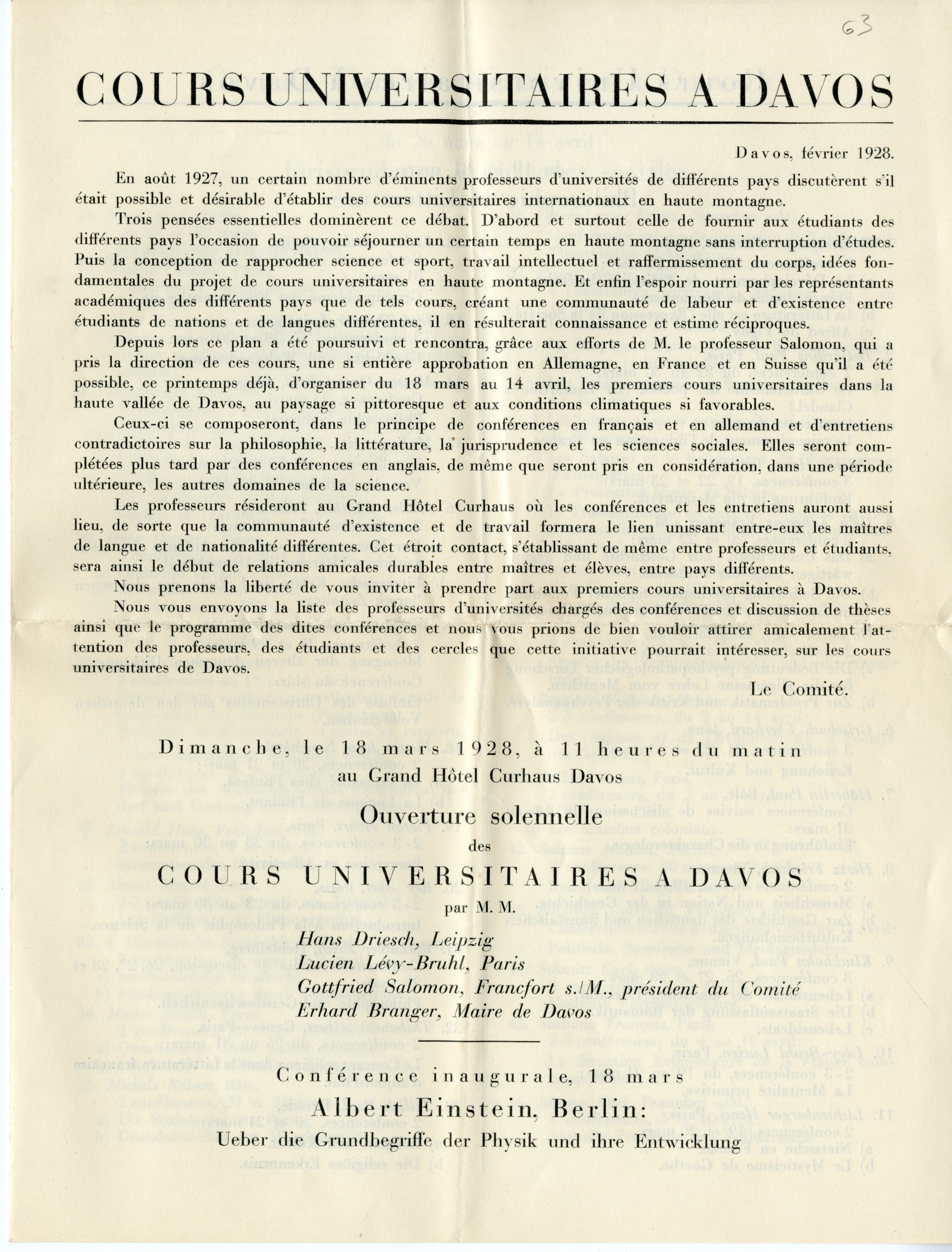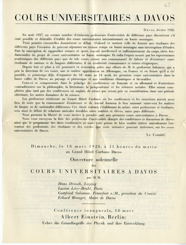 Du 18 mars au 14 avril 1928 se sont tenus dans la station thermale suisse de Davos des cours universitaires d’un genre particulier. L’ambition de leurs organisateurs était d’associer culture universitaire de haut niveau et culture physique, par la découverte des sports de montagne et ainsi de favoriser les échanges entre professeurs et étudiants venus d’Allemagne, de France et de Suisse. Les cours et les activités sportives étaient gratuits pour les étudiants, et les coûts de la pension et du trajet en train réduits.