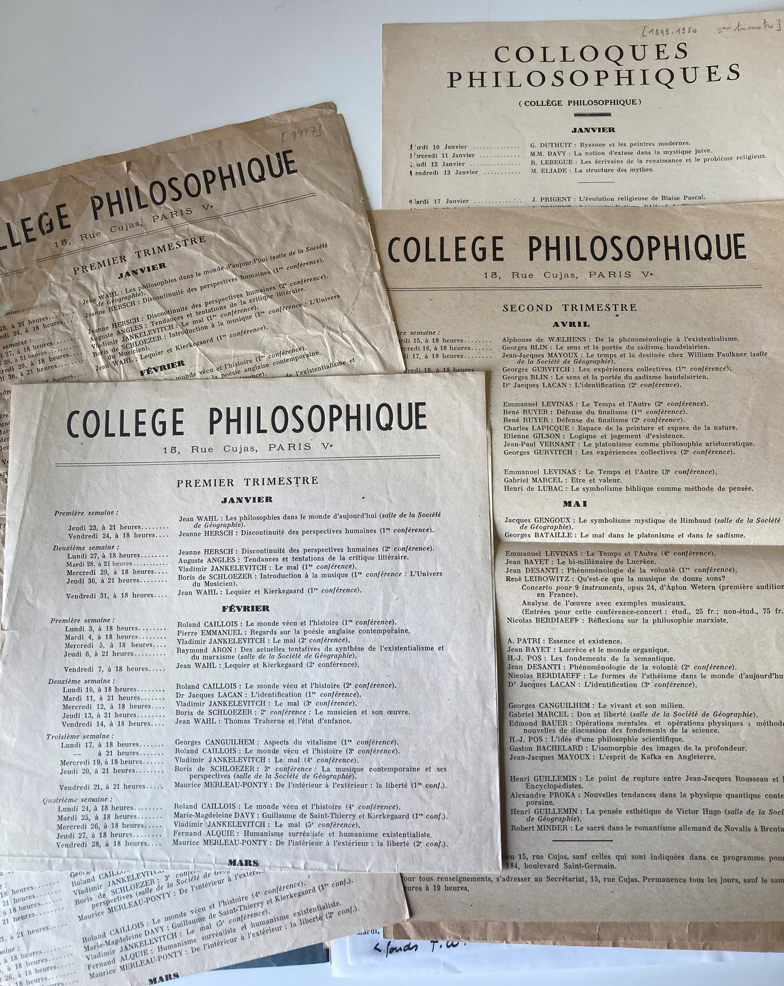 En 1947, Jean Wahl, en compagnie de Jean Bayet, Marie-Magdeleine Davy et Jean Paulhan, Jean Wahl créé une nouvelle institution philosophique libre, dans « le souci de donner à Paris vers lequel les yeux étaient tourné, un centre national et international de philosophie vivante où les tendances les plus diverses seraient représentées, en vue de chercher avec l’Europe, tout l’Occident, (et) le monde entier (…) où en est la pensée, où en est la philosophie [4] ». Inspiré par le format et l’esprit des séminaires américains, le Collège philosophique, dont les conférences se tenaient au cœur du quartier latin, sera pendant quelques année le carrefour d’échanges entre les principales tendances de la philosophie, de la littérature, de la psychanalyse et des sciences humaines et sociales alors émergeantes. Aux étudiants se mêlaient de simples curieux, contents de découvrir un lieu alternatif où la pensée contemporaine trouvait à s’exprimer librement. On trouve ainsi dans les archives de Jean Wahl les premières esquisses de programmes, listes de noms et affiches des conférences du Collège philosophique. Les noms de Ferdinand Alquié, Vladimir Jankélévitch, Maurice Merleau-Ponty côtoient ceux de Georges Bataille, Jacques Lacan, Yves Bonnefoy et Michel Butor. Les américains de passage à Paris avaient enfin le loisir de pouvoir entendre Jean-Paul Sartre et autres intellectuels « qui toujours ne sont pas entendus à la faculté des lettres ou au Collège de France [5] ».