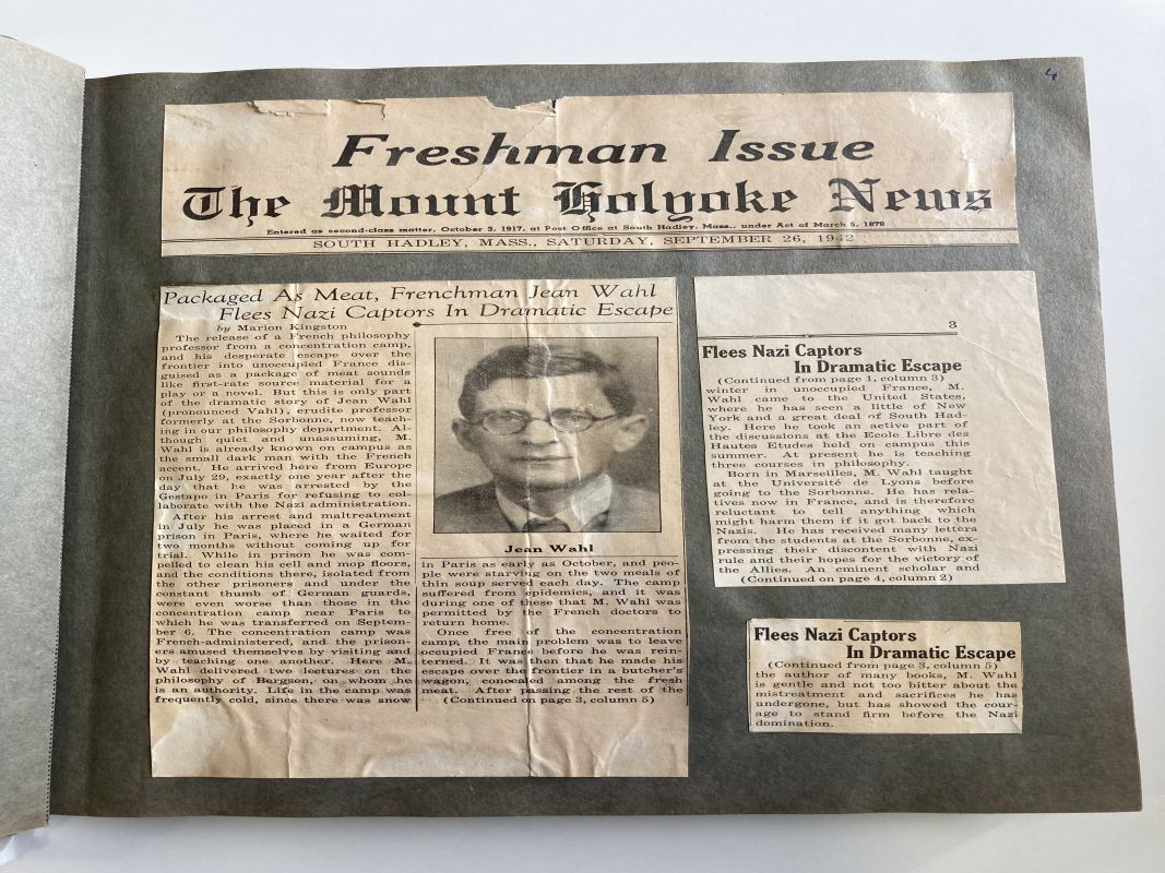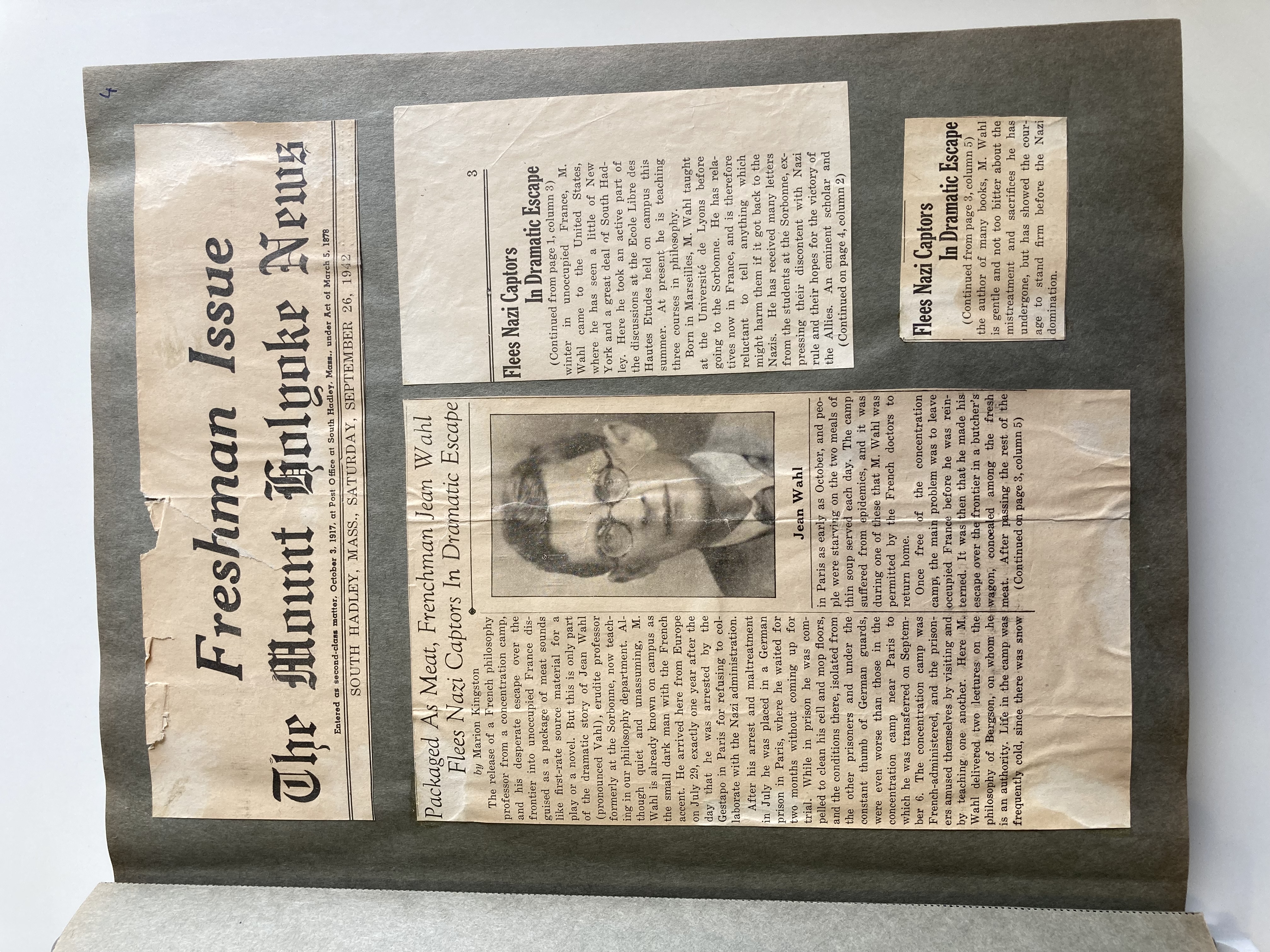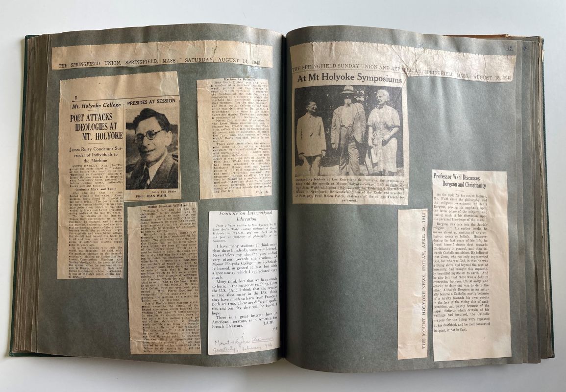 Feuilletant les pages fragiles de cet album, on y apprend qu’il donnait des conférences sur les relations de Bergson à l’Église catholique et sur la poésie en France de 1940 à 1942. En août 1943 les Entretiens de Pontigny ressuscitèrent sur le campus de Mount Holyoke du fait de la présence dans ce collège féminin américain de nombreux professeurs et étudiantes qui avaient assisté aux Décades bourguignonnes, comme Gustave Cohen ou Jacques Maritain. À cette occasion, plusieurs articles évoquent le visiting professor Jean Wahl animant les discussions sur « L’art et l’homme ». On trouve enfin dans cet album un long article sur le parcours et la pensée de Wahl, en provenance du New Yorker, daté du 12 mai 1945.