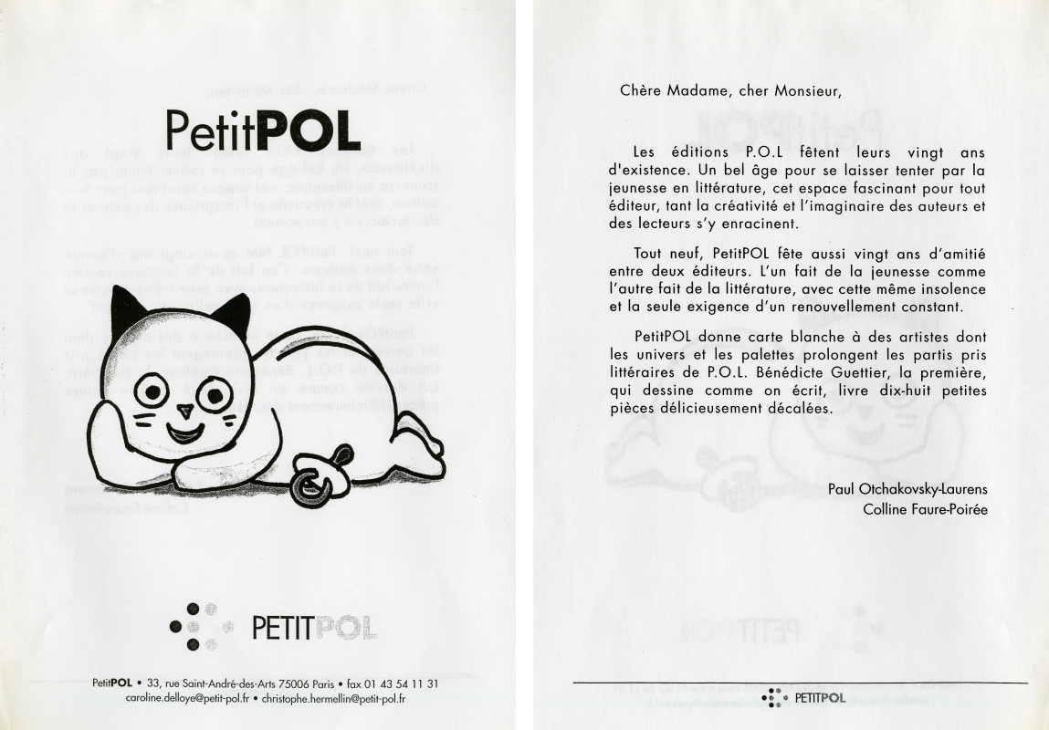 Né d’une collaboration avec la directrice de la collection jeunesse « Giboulées » de Gallimard, Colline Faure-Poirée, PetitPOL démarre en grande pompe avec la publication de dix-huit ouvrages de Bénédicte Guettier, créatrice de l’âne Trotro et publiée par Gallimard jeunesse. POL compte ainsi miser sur le succès de Bénédicte Guettier et le nombre de publications, avec deux collections : les « P’tits Caractères » et « Popaul », ce petit chaton qui sert d’ailleurs de mascotte au premier catalogue de l’édition.