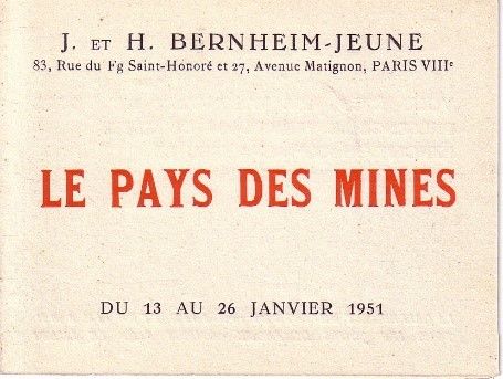 Le Pays des Mines s’installe du 13 au 26 janvier 1951 dans une galerie d’art luxueuse, située à Paris dans le quartier par excellence des mondanités bourgeoises et de la spéculation marchande, la galerie Bernheim-Jeune, rue du Faubourg Saint-Honoré. L’exposition porte le sous-titre éloquent de « Contribution à l’élaboration d’un nouveau réalisme français ». Elle est conçue à la manière d’un reportage de la vie du mineur.