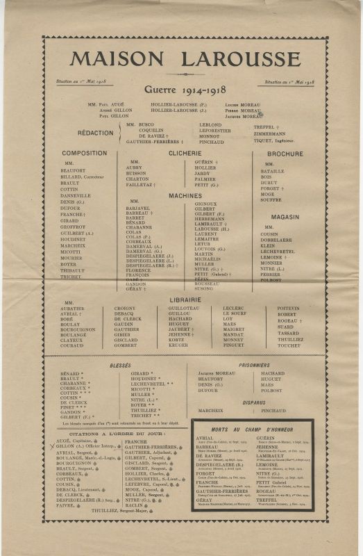 Parallèlement à ces courriers, les éditions Larousse impriment et affichent dans leurs murs des tableaux du personnel qui donnent les noms des soldats cités à l’ordre du jour, blessés, prisonniers, disparus ou morts au champ d’honneur, ainsi que les noms de ceux continuant à travailler dans les sections de la maison : librairie, rédaction, composition, machines.