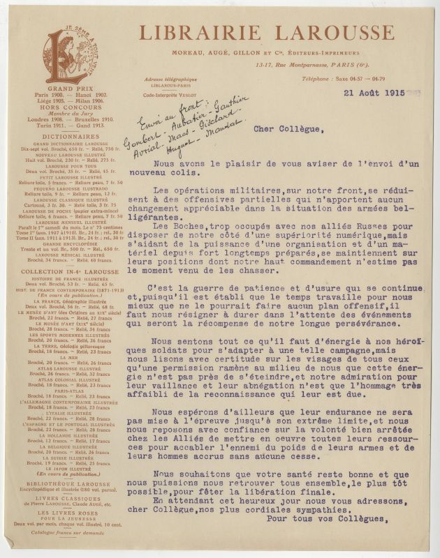 Peut-être les employés des éditions Larousse mobilisés ont-ils eu semblable pensée en recevant ces lettres de l’arrière, rédigées par Paul Gillon, membre de la direction, neveu par alliance d’Augustin Boyer, l’associé de Pierre Larousse et signées par l’ensemble du personnel resté en poste à Paris.