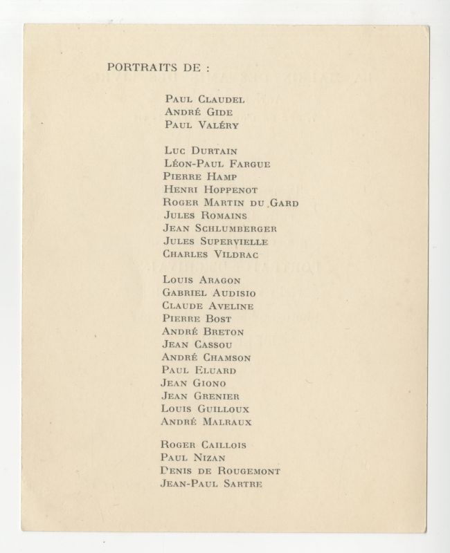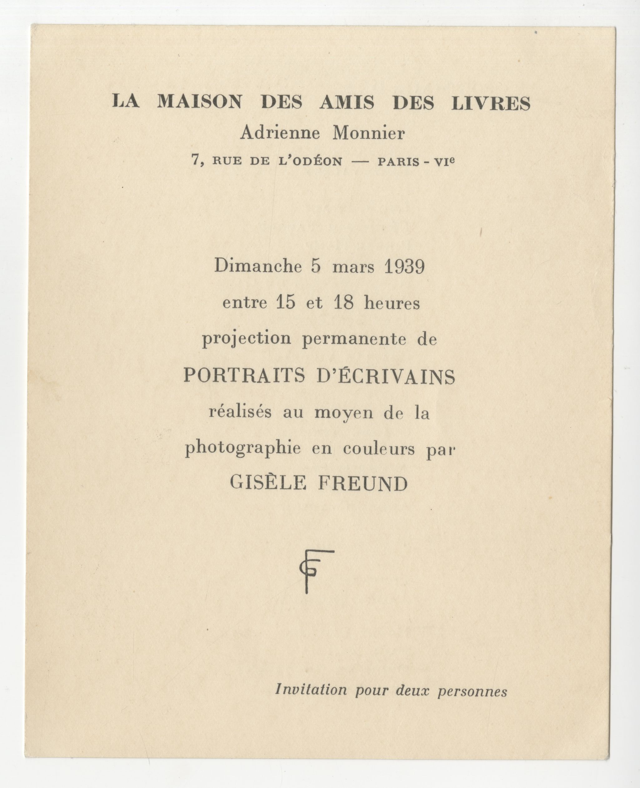 C’est dans cette même librairie et toujours avec la complicité d’Adrienne Monnier, qu’elle organise sa première projection de diapositives de « Portraits d’écrivains », le dimanche 5 mars 1939. Le carton d’invitation nous fournit la liste des écrivains photographiés à cette date.