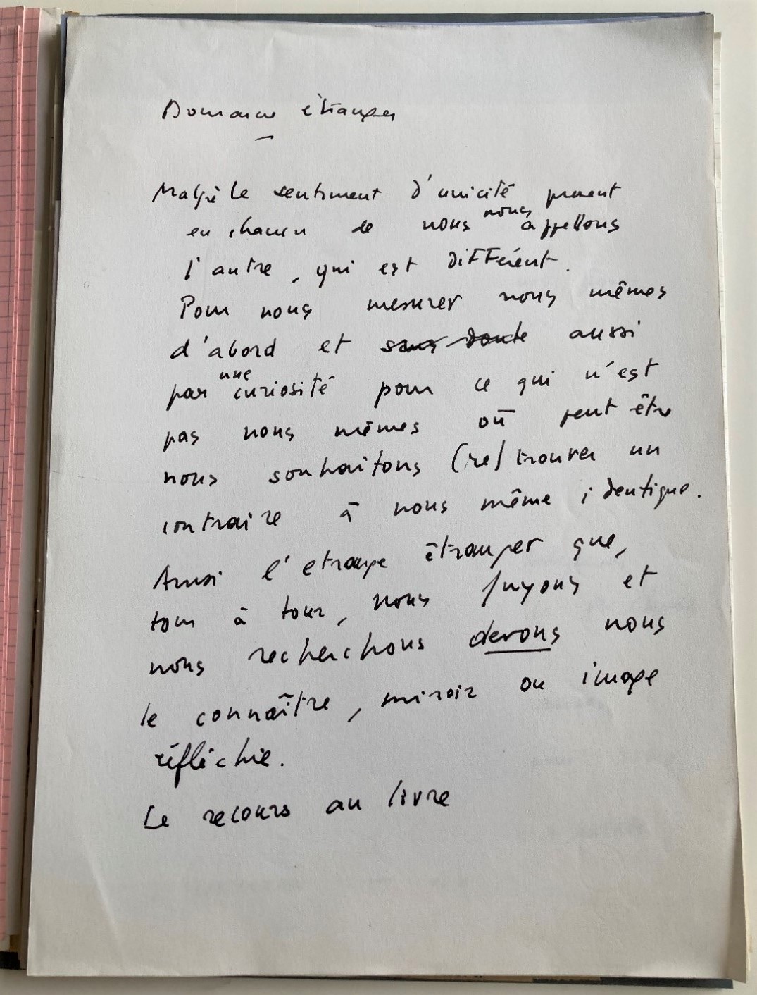 « Domaine étranger. Malgré le sentiment d’unicité présent en chacun de nous, nous appelons l’autre, qui est différent. Pour nous mesurer nous-mêmes d’abord et aussi par une curiosité pour ce qui n’est pas nous-mêmes où peut-être souhaitons (retrouver un contraire à nous même identique). Aussi l’étrange étranger que, tour à tour, nous fuyons et nous recherchons devons-nous le connaître, miroir ou image réfléchie. Le recours au livre. »