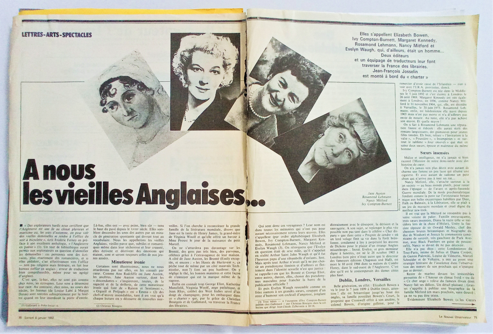 «… La presse ne manqua pas de saluer le retour en librairie de ces auteurs ; Jean-François Josselin, dans le Nouvel Observateur, intitula « À nous les vieilles Anglaises » l’article où il se félicitait du retour en librairie de Nancy Mitford, Rosamond Lehmann, Clemence Dane, Elizabeth Bowen et quelques autres [3] ».