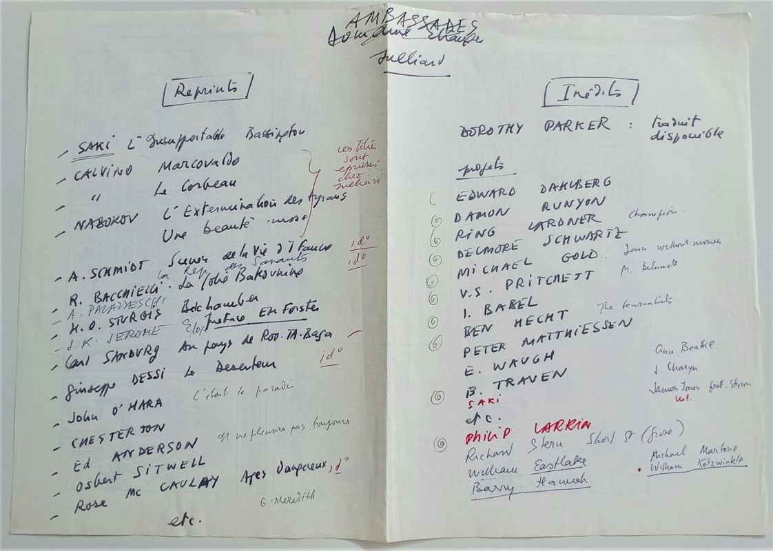 Le dossier contient enfin de nombreuses feuilles recouvertes de noms d’auteurs et de titres déjà publiés chez d’autres éditeurs et tombés dans l’oubli, ou de titres inédits en français, auxquels Jean-Claude Zylberstein pense pour la nouvelle collection. Dans les « reprints » figurent les titres de Saki, L’insupportable Bassington (publié en 1992, n°2244), Italo Calvino, Marcovaldo (publié en 1981, n°1411), Le Corbeau vient le dernier (publié en 1981, n°1447), Vladimir Nabokov, L’extermination des tyrans (publié en 1993, n°2371)… Dans le domaine des auteurs dont les œuvres sont alors inédites en France et que l’éditeur rêve de donner à lire au public français on trouve Dorothy Parker, Edward Dalberg, Ring Lardner, Delmore Schwartz, Isaac Babel et plusieurs autres.