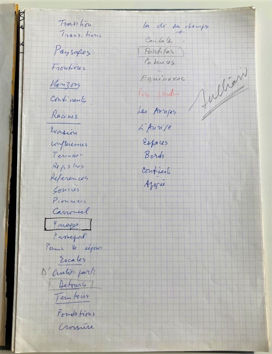 À cette collection, il fallait trouver un titre. Une feuille à petits carreaux présente des mots jetés, sans ordre apparent. On y trouve le registre du lieu et de l’espace : « paysages », « frontières », « espaces », « continents », « confluences ». Celui du déplacement : « évasion », « passeport », « croisière », « la clé des champs », « pas perdus ». L’encrage, avec les mots « tradition », « racines », « terrasse », « territoires », « fondations ». Certains mots sont soulignés : « horizons », « racines », « escales », « territoires ». D’autres sont encadrés : « parages » (en gras), « détours ».