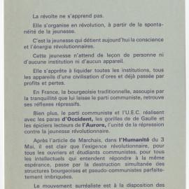 Le 14 juillet 1966, en ouverture de sa conférence à la décade de Cerisy-la-Salle sur Le Surréalisme dirigée par Ferdinand Alquié, Jean Schuster déclarait : « Mesdames, Messieurs, le surréalisme se distingue des courants de la pensée révolutionnaire, antérieure ou contemporaine, par son pessimisme fondamental quant au destin de la liberté. Cela tient non pas tant aux expériences que les surréalistes ont vécues au même titre que d’autres, mais profondément à ce que, d’une part, le surréalisme n’est pas un humanisme et, d’autre part, à ce que le rationalisme, généralement tenu pour une force d’émancipation est, à son regard, le plus accompli des systèmes d’oppression de la pensée. »