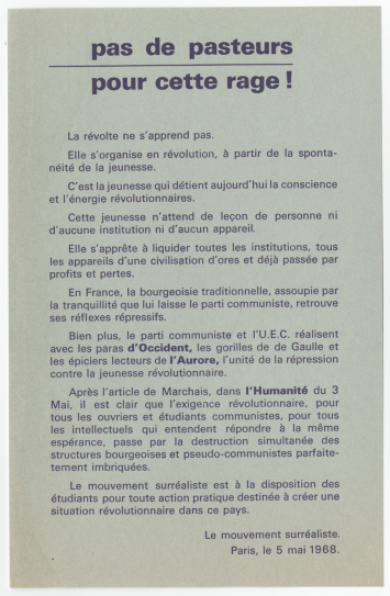 Ce tract imprimé en cinq couleurs a été composé collectivement au domicile de Claude Courtot, 28 rue de Douai (Paris, IXe) : plusieurs surréalistes apportèrent leur contribution à sa mise au point : Annie Le Brun, José Pierre, Vincent Bounoure, Gérard Legrand, Claude Courtot et Jean Schuster, qui en proposa le titre à double entente. Pas de Pasteurs (avec une majuscule et une pointe d’humour), parce qu’il s’agit surtout de ne pas mithridatiser ceux que la presse désigne comme les « enragés » : leur révolte doit se déployer le plus librement possible. Et aussi : pas de pasteurs ( avec une minuscule), parce que les masses éclairées n’ont besoin de personne pour leur indiquer quelle marche suivre.
