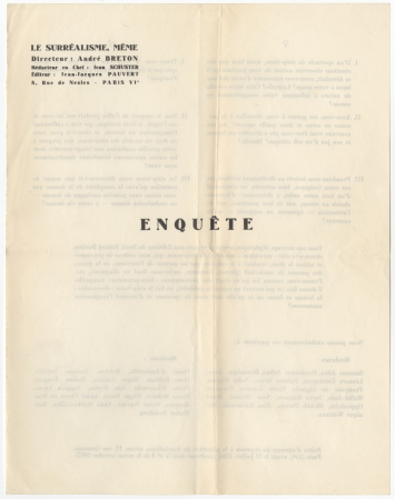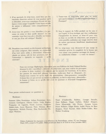 Recueillant des réponses d’hommes et de femmes, cette enquête parue dans deux livraisons de la revue Le Surréalisme, même 4 et 5 (1958-1959) entendait réagir à l’une des Mythologies (1957) de Roland Barthes.
