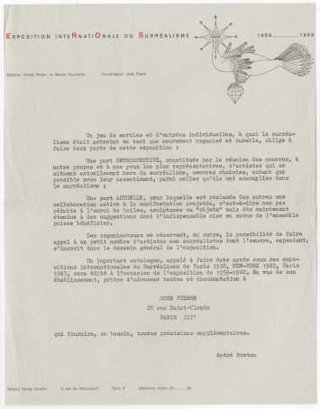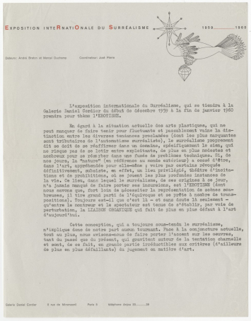 Breton précise aux participants de l'exposition quels seront les grands principes de cette manifestation organisée dans la galerie de Daniel Cordier, 8 rue de Miromesnil (Paris, 8e).