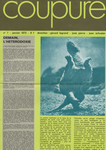 Après 1968, Coupure entend répondre à la crise de l’imagination. Cette revue rend finalement manifeste que l’énergie théorique et poétique propre au mouvement surréaliste n’a pas réussi à se revivifier. Question de personnes ? Question de contexte politique et social ? Question d’enfermement théorique dans des présupposés qu’il conviendrait de penser autrement ? Coupure ne pouvait être qu’une revue de transition vers quelque chose de nouveau encore à définir.