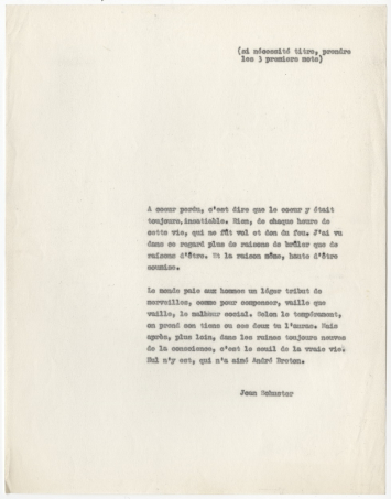 Poème écrit par Jean Schuster, qui n'a finalement paru que de manière posthume dans le recueil de ses œuvres poétiques : Une île à trois coups d'aile (Le Cherche midi, 2007).