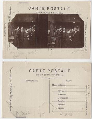 Pierre Albert-Birot imagina ce principe de carte postale, illustrée par une photographie personnelle, glissée dans les fentes aménagées à cet effet .Ici, une photo de groupe, avec de gauche à droite, Germaine de de Surville et son mari Pierre Albert-Birot, Chana Orloff et son mari Ary Justman, et peut-être Serge Férat. « Carte postale pour civil ou poilu », 1915.