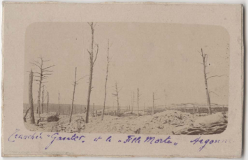 On devine sous la neige les lignes de la tranchée allemande « Gauter » et de la tranchée française, dite de « la fille morte ». Paysage en Argonne, sans date.