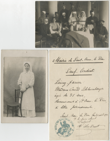 Établi le 30 août 1914, ce laissez-passer permettait à Louise Schlumberger de circuler dans le Calvados et d'exercer dans les hôpitaux militaires de la région, et de soigner les innombrables blessés et « gueules cassées » par éclats d'obus. Louise Schlumberger, infirmière de guerre, 1914.