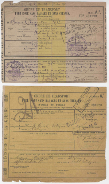 Feuilles de route nécessaires au simple soldat qui, profitant d'une permission, doit faire un trajet sur les réseaux de chemin de fer du Nord. Il doit se servir du bordereau du haut comme bon de transport, et faire viser le bordereau du bas, une fois arrivé à destination. Deux ordres de transport pour isolés sans bagages et sans chevaux, septembre - octobre 1918.