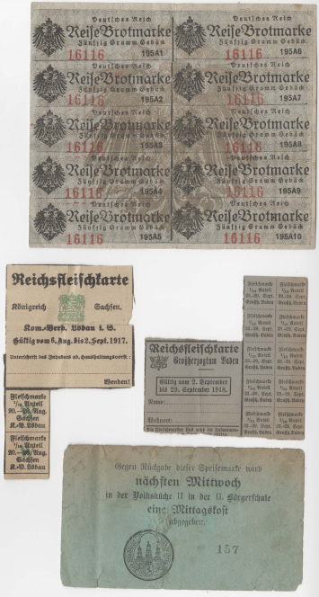 Tickets de rationnement allemand, en vigueur pendant la Grande Guerre, 1917 - 1918.