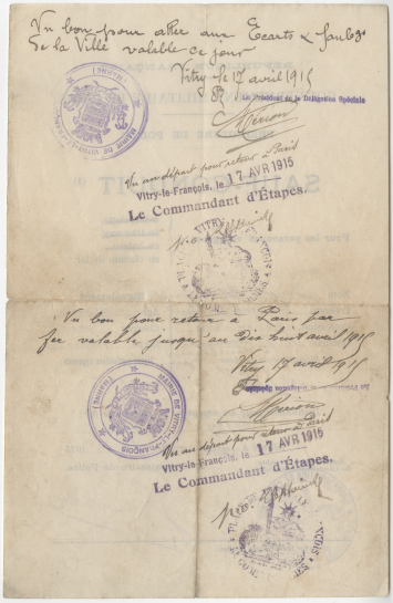Arrivé à Vitry-le-François, François Birot obtint le 17 avril l'autorisation de revenir à Paris. Verso d'un sauf-conduit, avril 1915.
