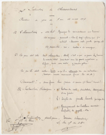 « L'Observation — son but : Renseigner le commandant sur l'ennemi. […] ses procédés: voir — écouter — se renseigner . »