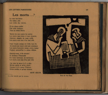 Poème de René Arcos, consacré à ses amis morts pendant la Grande Guerre, dont il est précisé qu'il a été « 5 fois interdit [de publication] par la censure ». Illustré par des bois de Van Rees, ce poème a été publié dans Les Lettres parisiennes, n°8 (deuxième année, 1er janvier 1920). « Les Morts…», 1er janvier 1920.