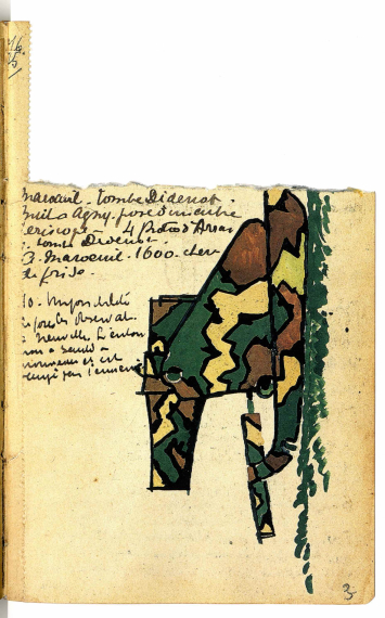 Avec ce canon en tenue de camouflage, Mare note les opérations auxquelles il a participé: « pose d'un arbre périscope », « à Mareuil, 1600 chev[aux] de frise ».