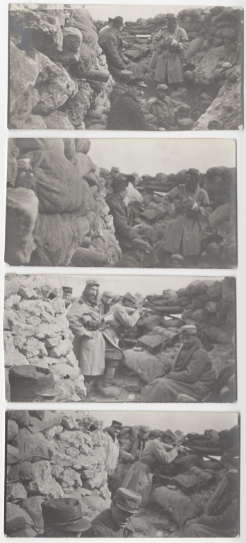 Dans ces 4 clichés successifs, on reconnait la haute silhouette de Henri Bernstein, porteur d'un képi et d'une sorte de cagoule, 1915.