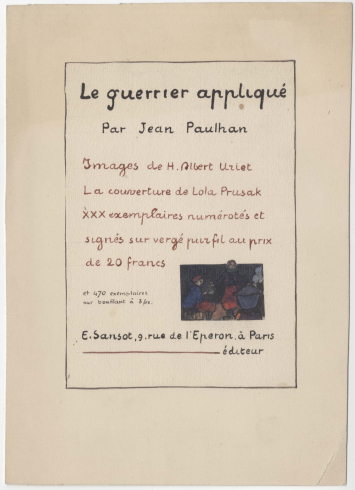 Jean Paulhan raconte, dans Le Guerrier appliqué, sur un ton sobre et enfantin, la réalité quotidienne de sa Grande Guerre. Illustré par Albert Uriet, son compagnon de guerre, ce livre sera publié à compte d'auteur aux éditions Sansot en 1917. Projet de souscription pour Le Guerrier appliqué, 1916-1917.
