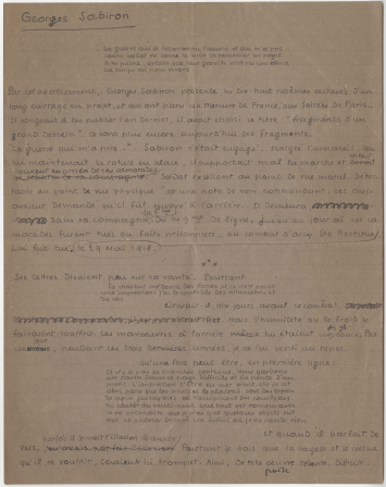 Manuscrit du texte que Jean Paulhan donna sur son ami Georges Sabiron, poète, collaborateur du Mercure de France, des Soirées de Paris, engagé volontaire malgré sa claudication et tué au Front en 1918. « Georges Sabiron », 1924.