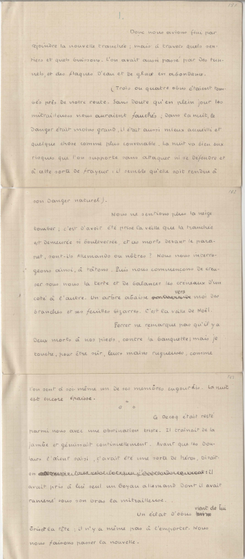 Récit de la Grande Guerre par Jean Paulhan, mobilisé comme sergent au 9e régiment de Zouaves depuis le 1er août 1914 et blessé dès décembre suivant. Pages du manuscrit, 1916.