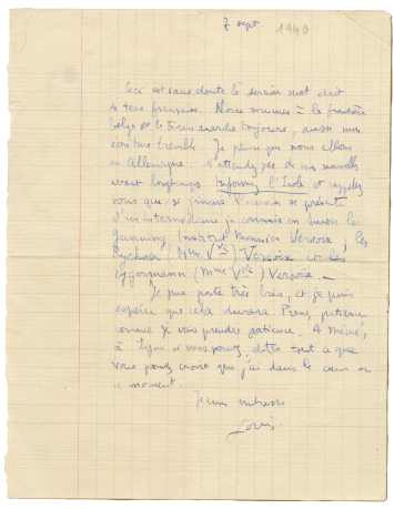 Capturé le 21 juin 1940 par les Allemands à Vannes, le jeune étudiant Louis Althusser est enfermé début septembre dans un wagon avec ses compagnons, à destination de Rouen, puis de l’Allemagne. Le 7 septembre, il griffonne, sur des feuilles de cahier d’écolier, deux missives similaires pour son oncle André Boulogne, qu’il jette sur la voie depuis le train de prisonniers qui l’emmène vers la frontière belge : « Ce dernier mot de terre française. Le train qui fait trembler mon écriture marche toujours et je crois bien que nous allons en Allemagne. Prévenez l'École [normale supérieure]. » Au dos, cette requête, qui a été exaucée : « Prière d’adresser ce mot à M. Boulogne […] Merci infiniment. »