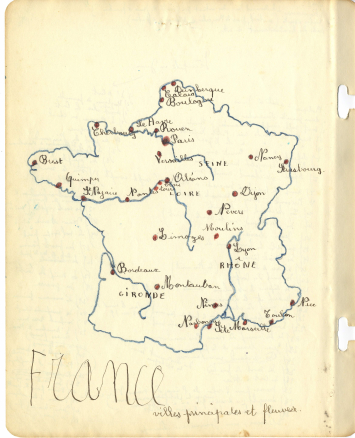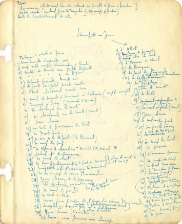 Plan de la première partie, intitulée « Tempête en juin », du roman, Suite française, qu’Irène Némirovsky écrit à Issy-L'Evêque en 1940-1942 : ce roman, inachevé au moment de son arrestation, ne sera publié qu’en 2004 chez Denoël. Glissée entre les pages compactes d’un épais manuscrit relié, cette carte de la France, probablement dessinée par une de ses filles…