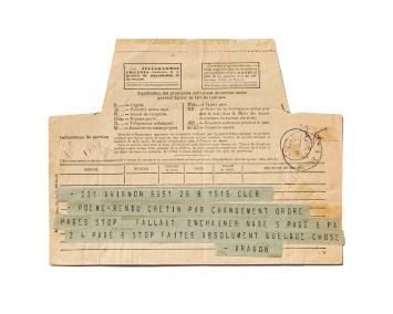 Télégramme du 8 août 1942 de Louis Aragon à René Tavernier, signalant l’erreur de présentation de « Nymphée » dans Confluences : « POEME RENDU CRETIN PAR CHANGEMENT ORDRE PAGES – STOP – FALLAIT ENCHAINER NAGE [SIC] 3 PAGE 5 PAGE 2 4 PAGE 6 – STOP –FAITES ABSOLUMENT QUELQUE CHOSE – ARAGON ».
