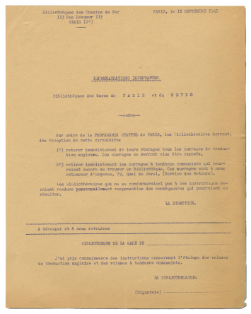 « Recommandations importantes » à l'usage des bibliothèques des gares de Paris et du métro, demandant à retirer des étalages tous les ouvrages de traduction anglaise et de tendance communiste. 11 septembre 1941. En bas de page, un coupon détachable, à renvoyer à la Librairie Hachette, prouvera que le gérant de la bibliothèque a bien pris connaissance de cette instruction.