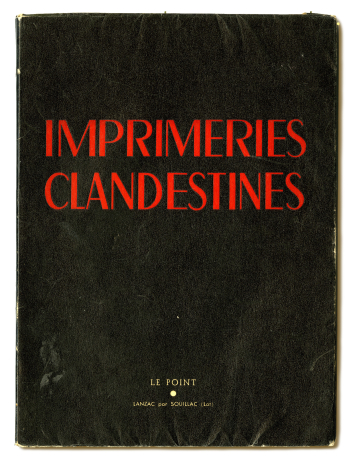L’imprimeur parisien Ernest Aulard et son contremaître Pierre Doré tirèrent clandestinement sur leurs rotatives, les samedi et dimanche, pendant le repos hebdomadaire des autres ouvriers, les feuilles des volumes des éditions de Minuit. Ils sont ici replacés en situation en 1945 et photographiés par Robert Doisneau. Les clichés du jeune photographe illustrent le numéro XXXI, intitulé Imprimeries clandestines, de la revue Le Point, que Jean Lurçat, Efstratios Tériade et Maurice Betz font paraître en mars 1945 à Lanzac (Lot). Sur la page de droite, une histoire de la résistance littéraire, « Ariel casqué », rédigée par « Forestier » d’après les notes prises par Claude Morgan.