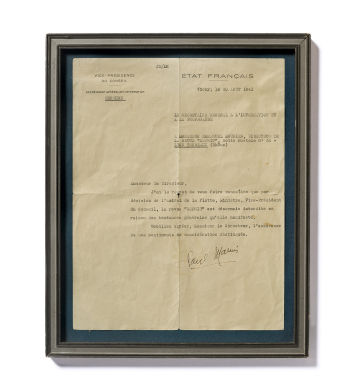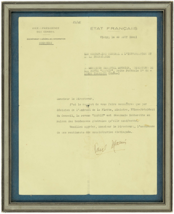 Lettre du 20 août 1941, de Paul Marion à Emmanuel Mounier, lui signifiant l’interdiction d’Esprit : « Monsieur le Directeur, / J'ai le regret de vous faire connaître que par décision de l'Amiral de la Flotte, Ministre, Vice-Président du Conseil, la revue “ESPRIT” est désormais interdite en raison des tendances générales qu'elle manifeste. » Cette lettre a été conservée sous cadre, après la guerre, par la famille de Mounier.