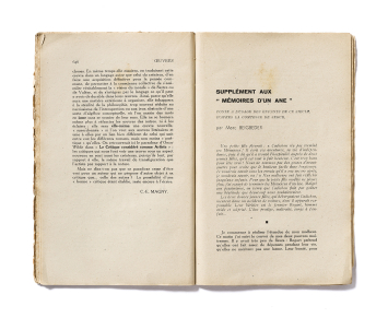 Marc Beigbeder, « Supplément aux “Mémoires d’un âne” », publié dans Esprit de juillet 1941. Ce « Conte à l’usage des enfants de ce siècle », d’après la Comtesse de Ségur, vaudra à Esprit d’être interdit par le secrétaire général à l’Information et à la Propagande, Paul Marion. Marc Beigbeder met en scène dans ce pastiche le vieil âne Cadichon [Pétain], en proie à son nouveau maître, le brutal fermier Bogart [Hitler] : ce dernier, à force de manier la carotte et le bâton, amène Cadichon à le servir aveuglément, au prix de toutes les trahisons : « Malgré son pessimisme, on verra que Cadichon finit par goûter une béatitude que beaucoup nous souhaiteraient. »