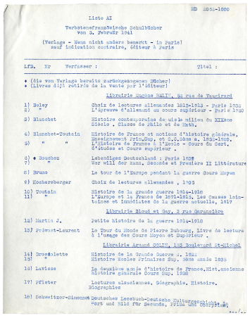 « Liste AI » des ouvrages scolaires dont la vente par les libraires – et par conséquent l'usage dans les classes – est définitivement interdite, à partir de ce 5 février 1941, par les autorités d'Occupation dans les départements de la Seine et de la Seine-et-Oise.
